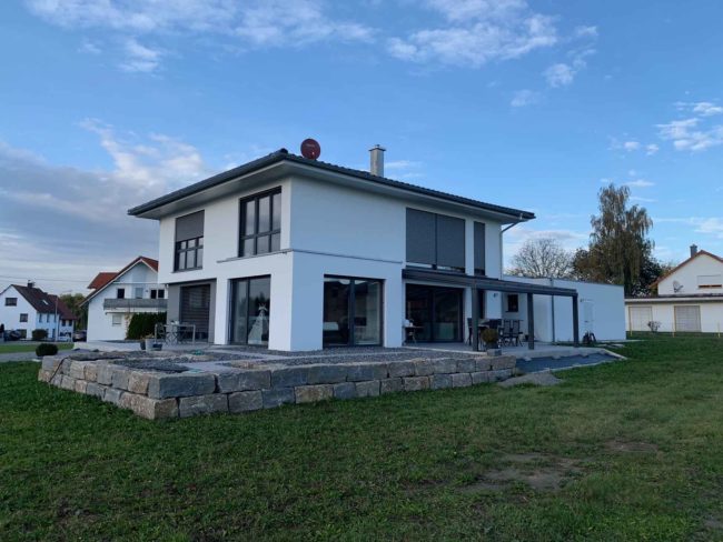 Villa in Grafenau Hier entstand ein Architektenhaus in den Hang hinein gebaut. Besonderheiten hier, ist es, dass die Nordseite die Hangseite ist, auf der sich alle Nebenräume befinden. Nach Süden orientiert sich das komplette Wohnen mit Blick in die Weinberge. Hier wurden alle EnEV Richtlinien nach dem heutigen Stand der Technik umgesetzt.